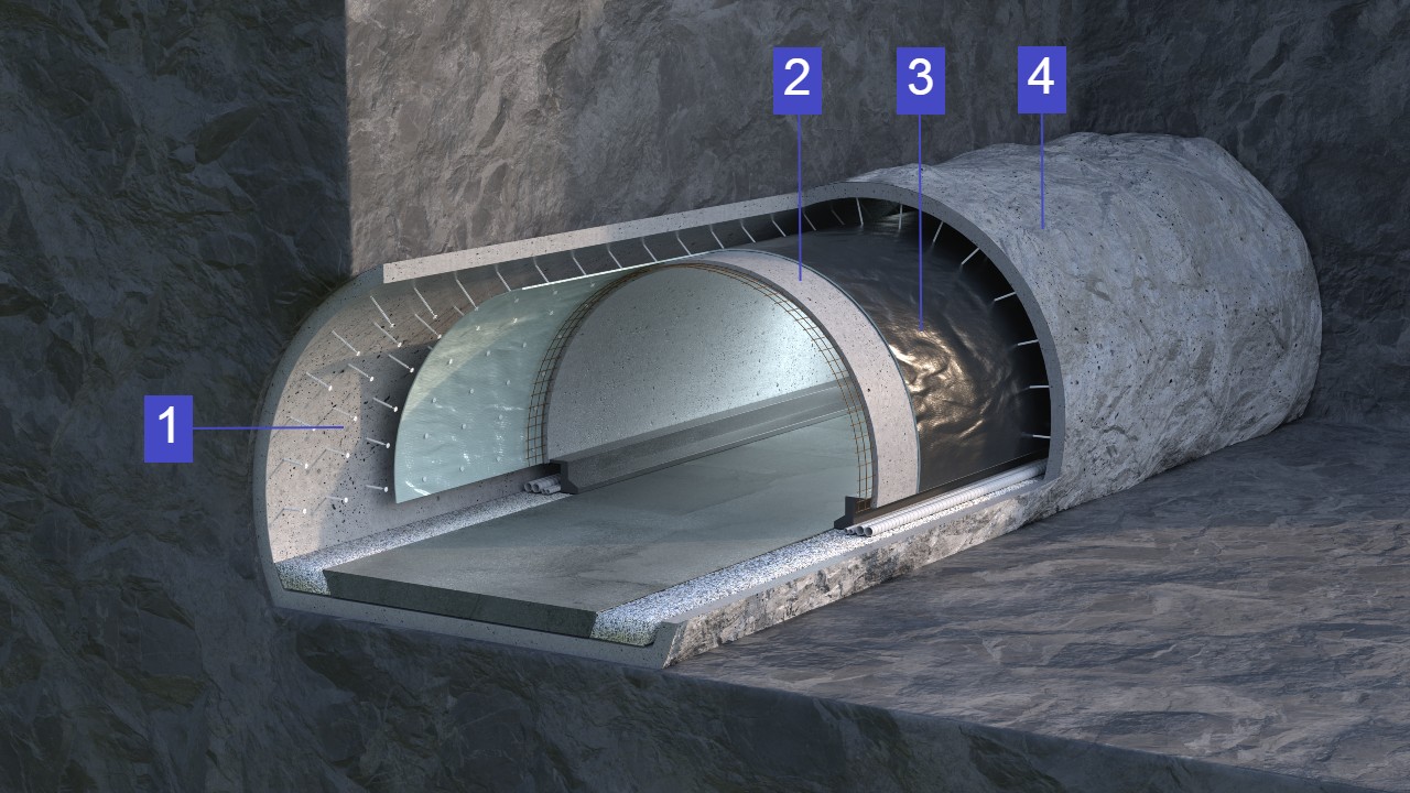 Järjestelmä koostuu vedenpitävästä kermistä, joka on kiinnitetty ankkurointipisteiden verkostoon, joka on noin 50 cm:n etäisyydellä ruiskubetonilla päällystetystä kalliosta. Sisäpuolella, liikenteen suuntaan, kermi on joko betonielementeillä tai ruiskubetonilla peitetty.