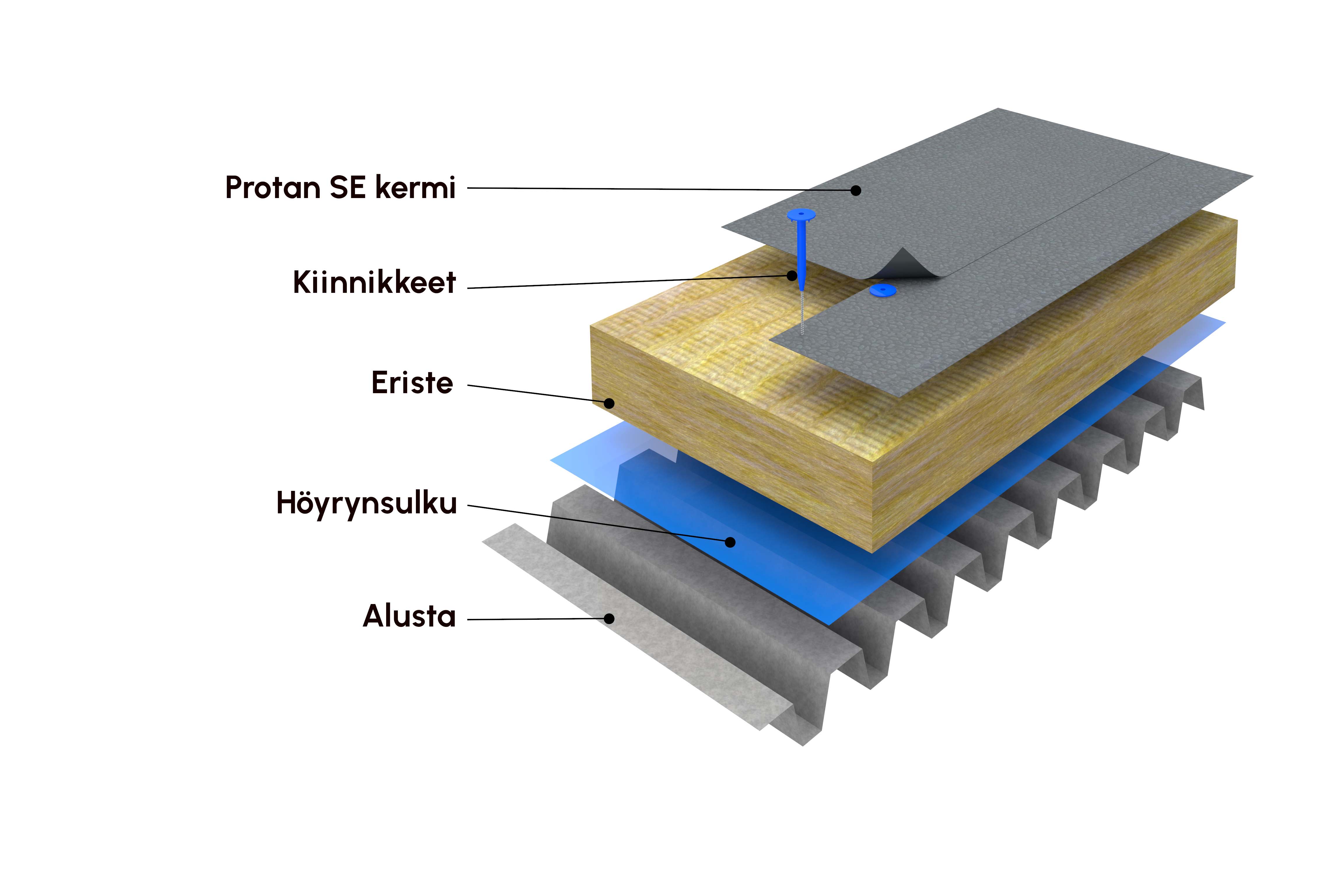 Protanin hyväksymä esimerkiksi polyeteenistä valmistettu höyrysulkukerros levitetään ensin alustalle, tämän jälkeen Protanin hyväksymä eristekerros ja Protan SE PVC yksikerros vesikate.